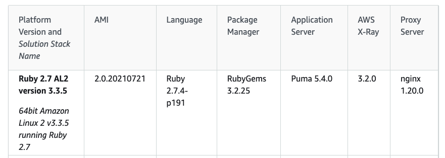 - Confirm using Ruby; choose the latest platform version (Ruby 2.7). Don't use the older Puma or Passenger versions.