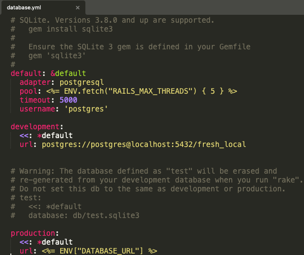 For local testing, our app needs a DB connection. In database.yml, remove sqlite and configure some hard-coded credentials for the local development environment. In production, they will be read from an environment variable. database.yml now looks like this: