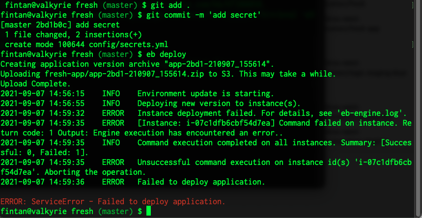 Oops - we omitted to set the production secret. We can address this error by saving secrets.yml in the app's config folder. Then we can run git add . and git commit -m 'bugfix', and try to deploy again with eb deploy.