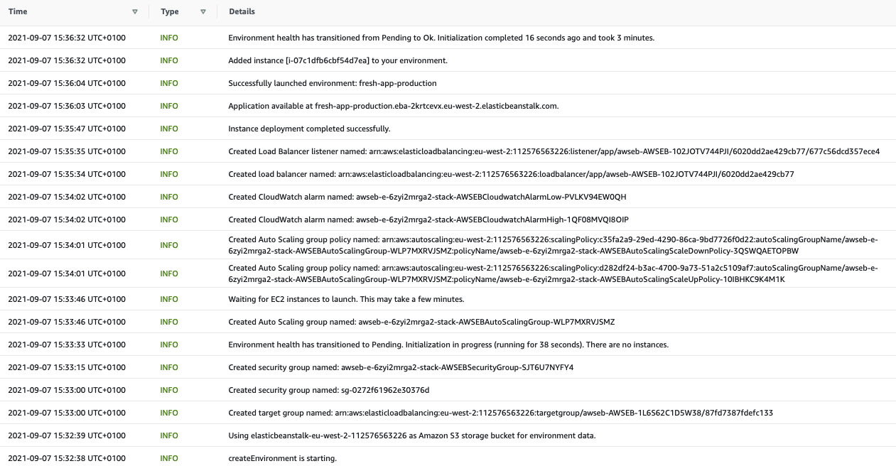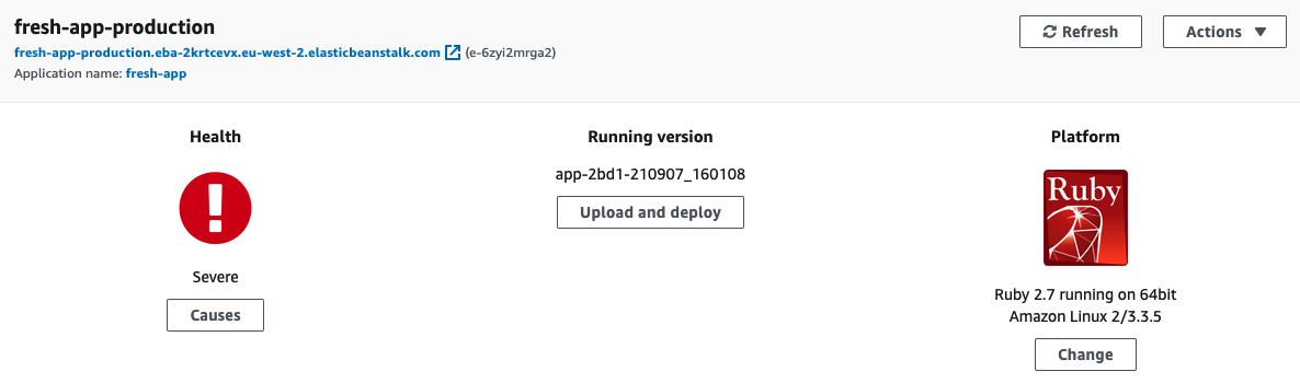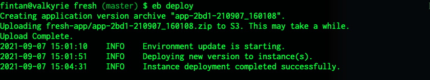 Now we can deploy our own app: run eb deploy fresh-app-production. Be aware that EB only deploys the last Git commit: if you have any uncommitted changes, they will not be deployed!