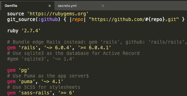 - In the Gemfile, we need to update the ruby version to ruby '2.7.4', then delete webpacker, turbolinks, jbuilder, bootsnap, spring, and spring-watcher-listen.