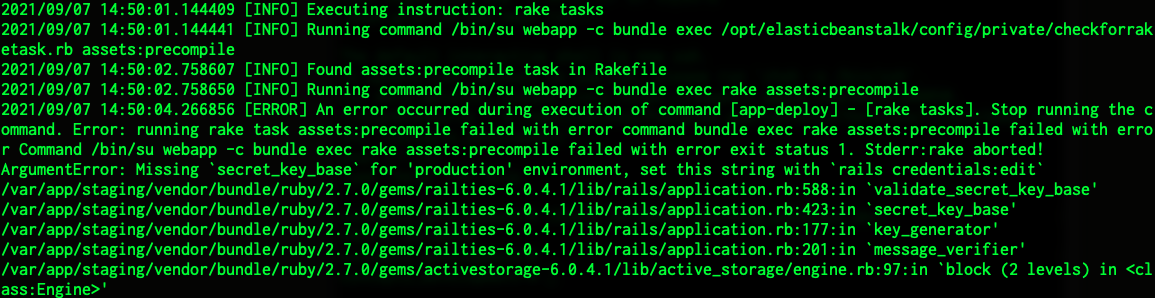 There are several key logfiles we should check. First run cat /var/log/eb-engine.log to check the Elastic Beanstalk deployment engine. Looking through the log, we can see EB downloading the app package and installing gems. It then encounters an error during asset precompilation, when it tries to start the Rails app: