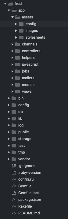 Now let's start a new Rails project called "fresh" with rails new fresh. After opening it in our favourite editor, we can see the Rails project structure: