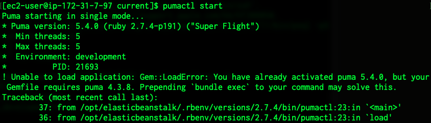 - We need to specify the Puma version: gem 'puma', '5.4.0', the same version EB is using.