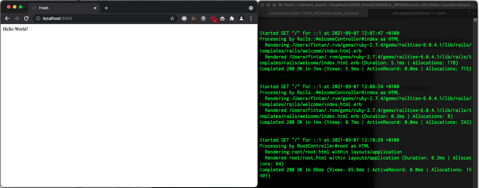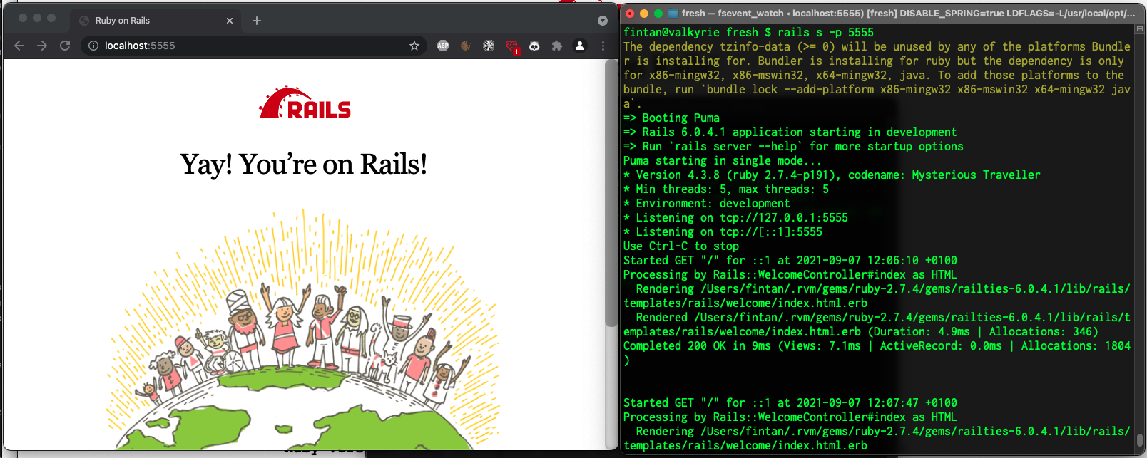 Now we can start the server on port 5555 using rails s -p 5555: the app should start fine. Then we can check localhost:5555 in the browser: