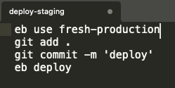 It can be very useful to automate this with a short Bash script which makes sure you are using the correct environment, then commits and deploys. We can use a pair of such scripts to deploy easily to production and staging (e.g. ./deploy-staging).