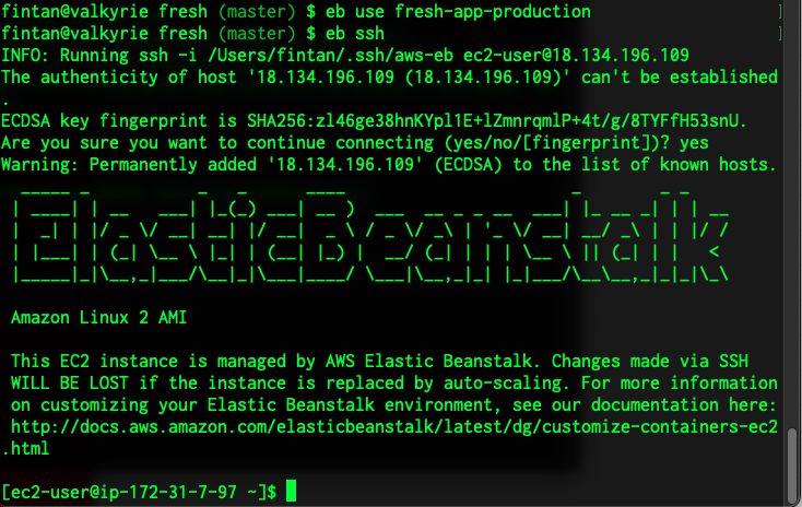 First, run eb use fresh-app-production so that we don't have to keep specifying the environment. Then run eb ssh and type yes. You should now be logged into the EC2 instance: