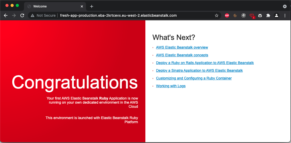 Once you have checked the configuration, click on Create environment. The process should take about 10 minutes. Once the environment is running, click on its URL (something like fresh-app-production.eba-fpfg63g.eu-west-2.elasticbeanstalk.com ). You should see the AWS welcome page, which is a simple Sinatra application: